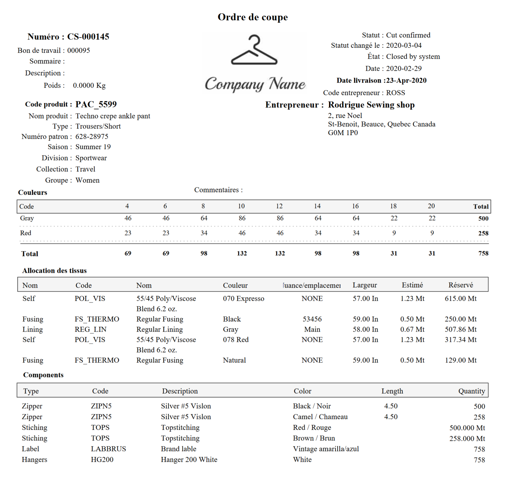 La fonction Analyse génère les Ordres de coupe automatiqument à partir des dates de livraison, des niveaux d'inventaire, des clients, des collections, des produits, des lots de tissu et des composantes disponibles. La processus inclus la réservation des tissus pour afficher les inventaires disponibles en direct. Le rapport Réception attendue Ordre de coupe donne l'évolution des Travaux et les date de livraison (coupe, confectiong, finition).