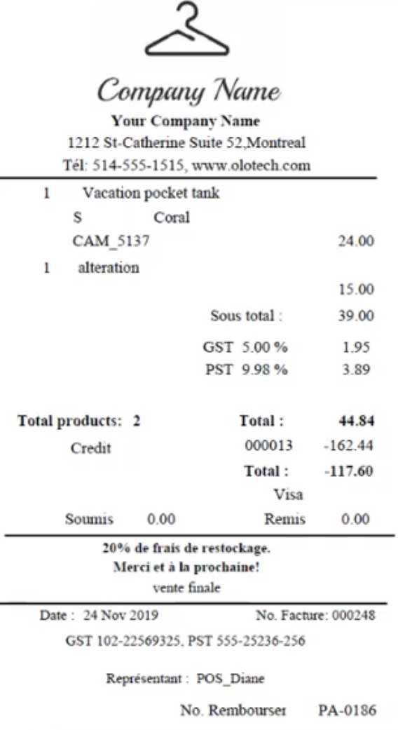 Le POS inclus des escomptes, escompte incluant taxes, les items non stock comme les altérations, les crédits à appliquer, les remboursements ainsi que 2 modes de paiement incluant et les certificats cadeau.